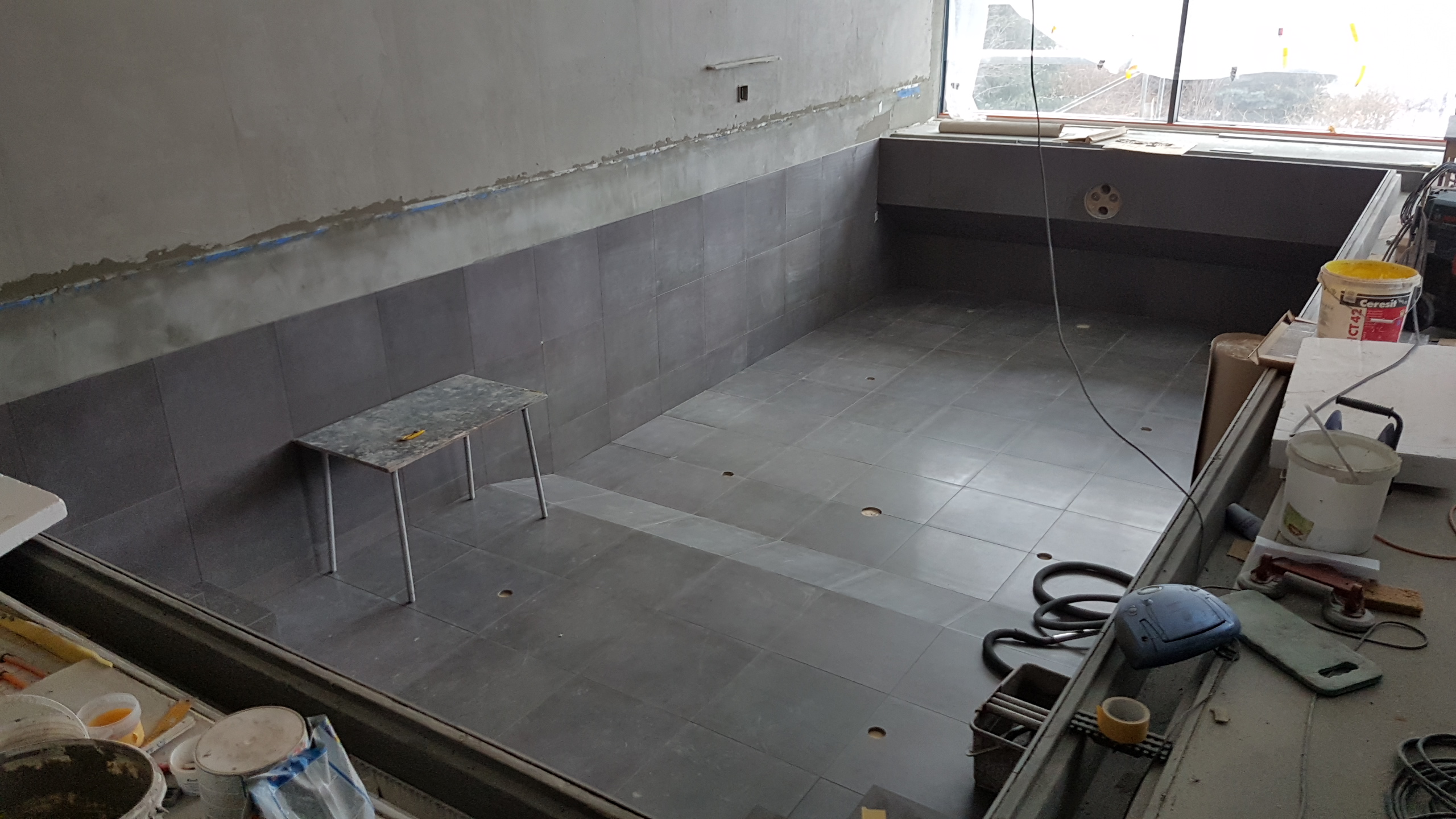 Jak už jsme výše uvedli, korpus bazénu je monolitická betonová vana vystavěná z vodostavebního betonu jejíž stěny zevnitř jsou nataženy hydroizolační stěrkou. Stěrka se nanáší přímo na betonový povrch ve dvou vrstvách, první je zpevněna síťovinou, do pracovních spár jsou namontovány těsnící pásky. Tím je zajištěna trvalá vodotěsnost bazénu. Na hydroizolační stěrku pak se provádí obklad keramikou nebo mozaikou, která je nalepena speciálním lepidlem a vyspárována pryskyřičnou spárovací hmotou. Naše firma pracuje se stavební chemii od Německé firmy Mapei (www.mapei.cz).